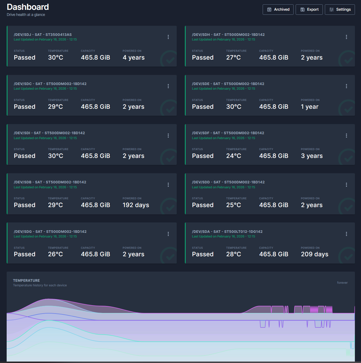 On the root node, I run a file browser web UI since Proxmox does not have one integrated. I also run a Docker with Scrutiny, a program that allows me to monitor my disks by viewing SMART parameters and notifying me on Telegram if anything goes wrong.
