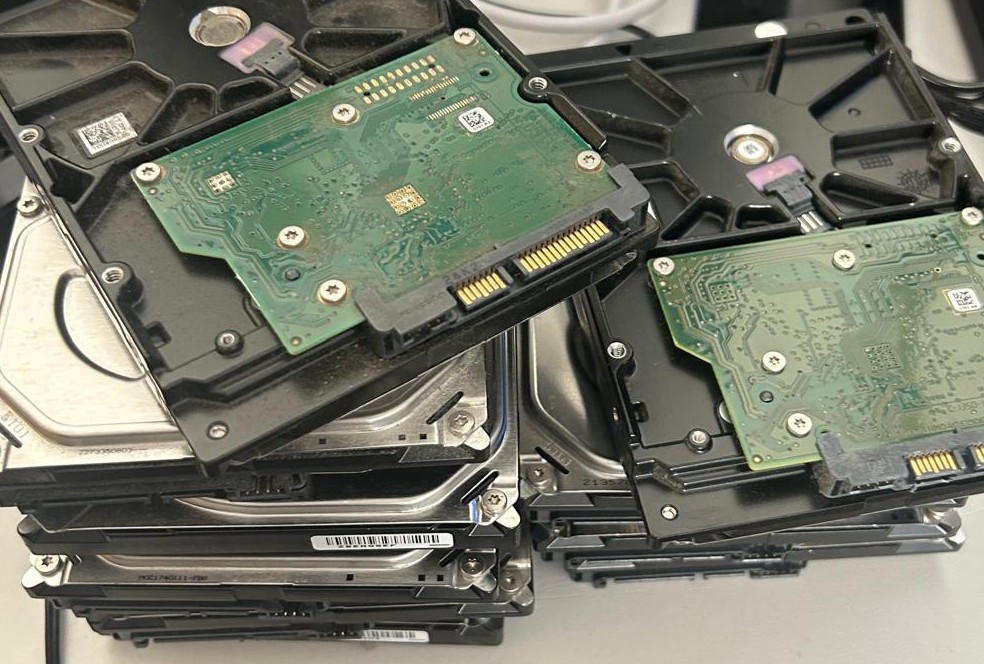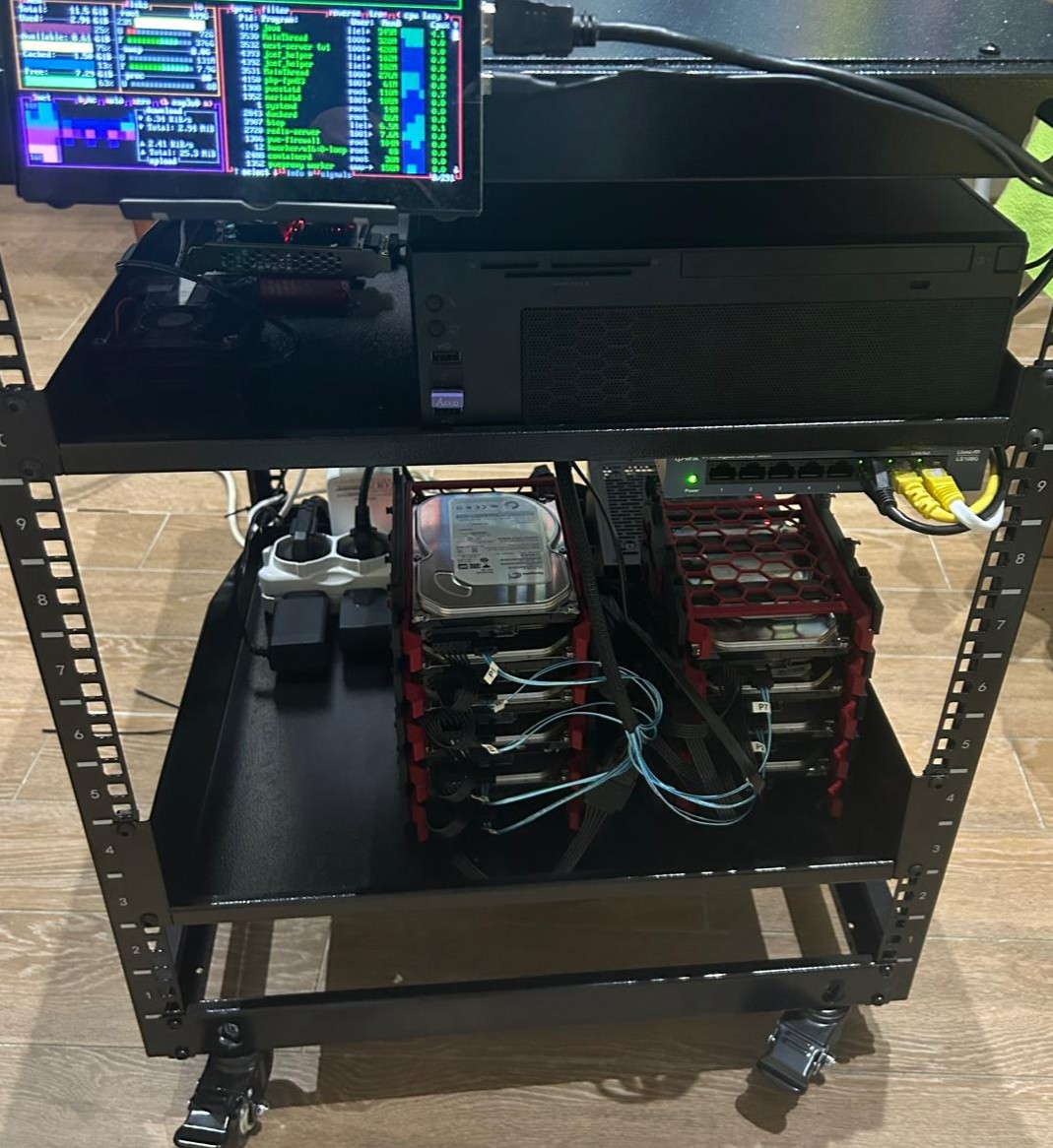 For storage, I used 9 HDD with 500 GB, powered by an external PSU. I made sure to test them and ensure they were all in good condition. Even though they are quite old, they can last at least another year. As I don't have RAID hardware, I bought a PCIe expander to SATA card, printed a 3D rack for the disks and bought two fans to cool them. I connected the disks to the expansion card and the expansion card to the main node.